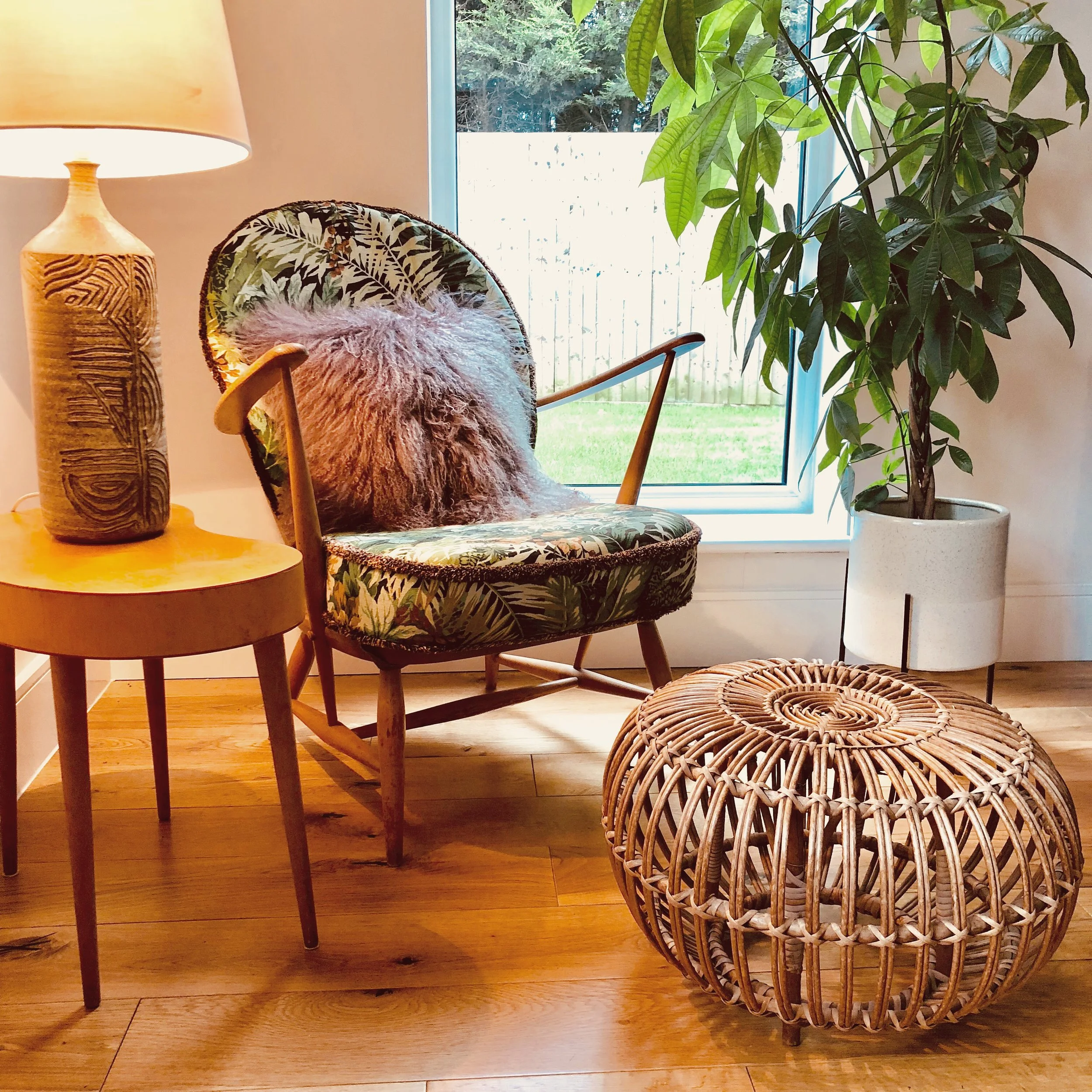 A large square room featuring our finest collection of Ercol original furniture from the 1960s and 70s and antiques. I’m talking an Ercol daybed, love seat and arm chair with original tropical print and brown fringing. Then there’s the French commode and antique writing desk. It’s why we made this room the eclectic mix of all our family heirlooms.